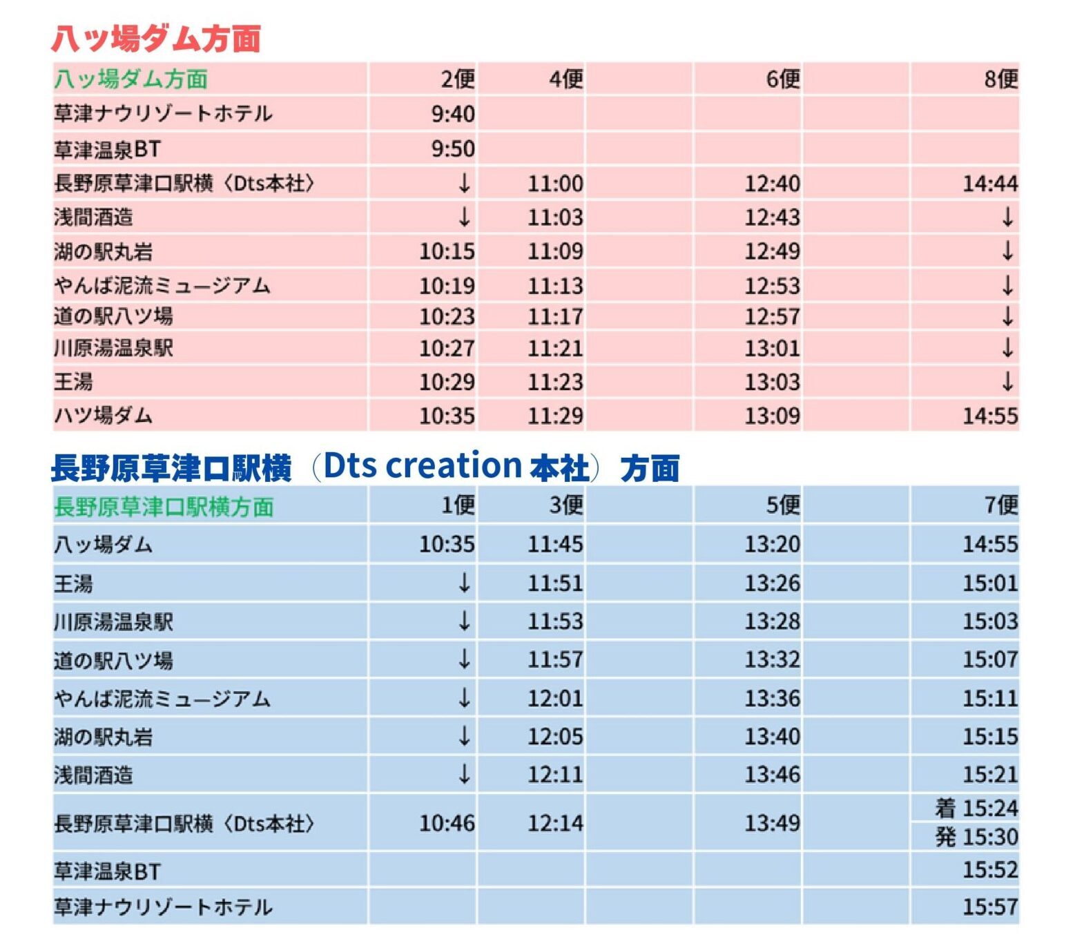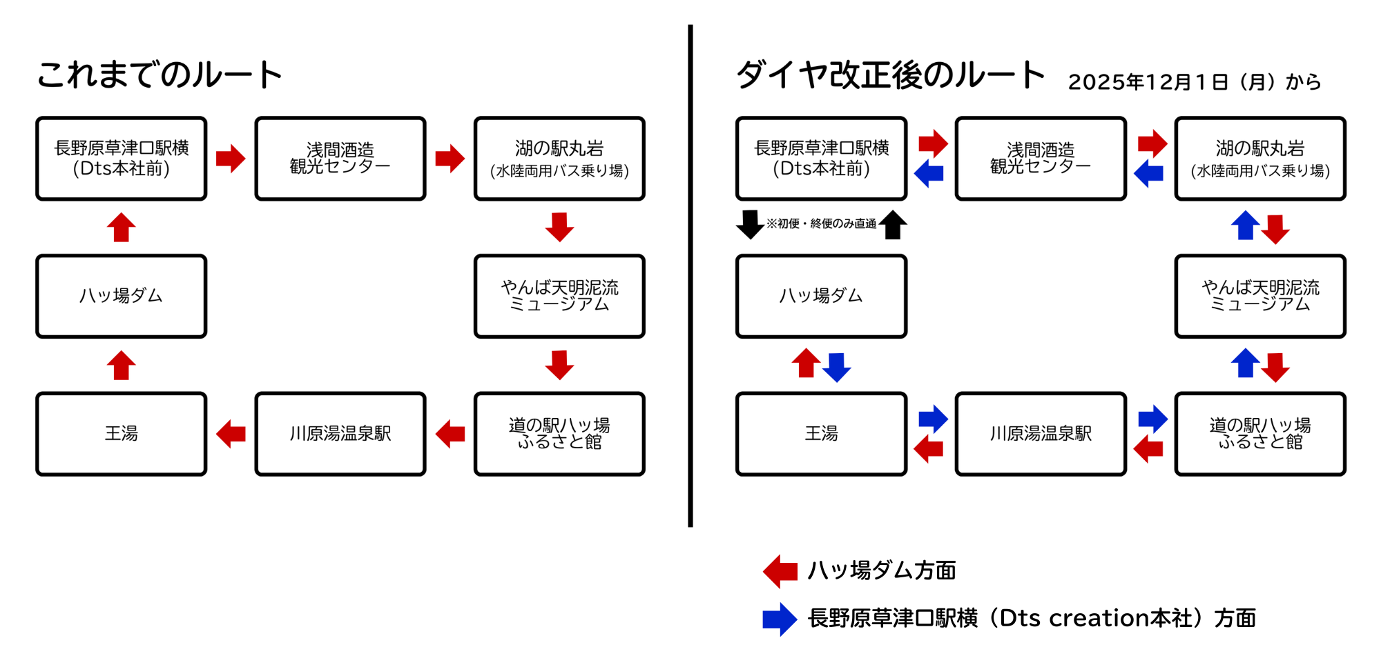 これまでは長野原草津口駅からダムへの一方向のルートでしたが、改正後はダムから各観光スポットを巡りながら駅へ向かうルートも運行いたします 。