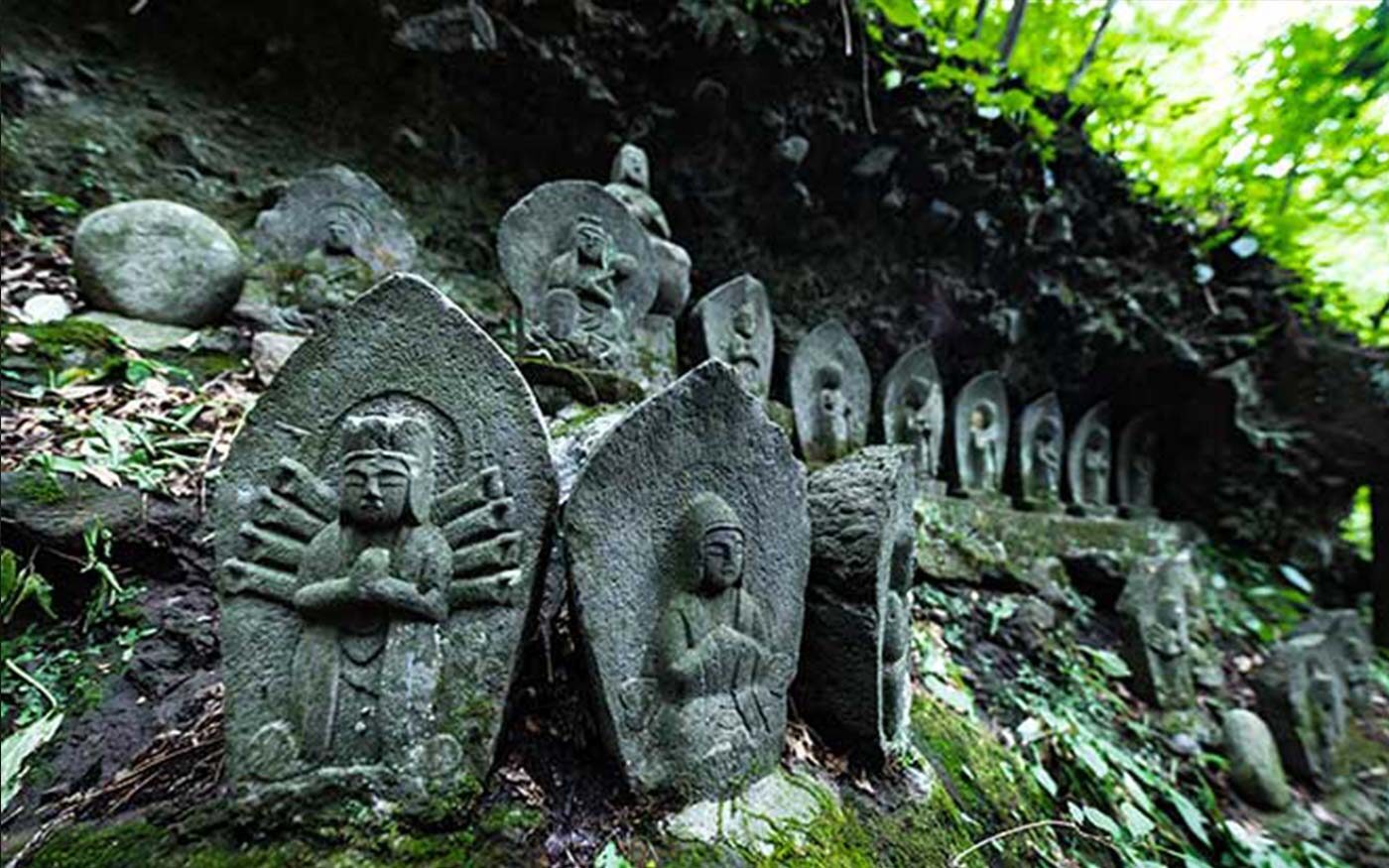 主に江戸時代中頃から終わりにかけて作られた約80体もの石仏群が、自然の地形を生かした岩棚や岩窟に並べられている。