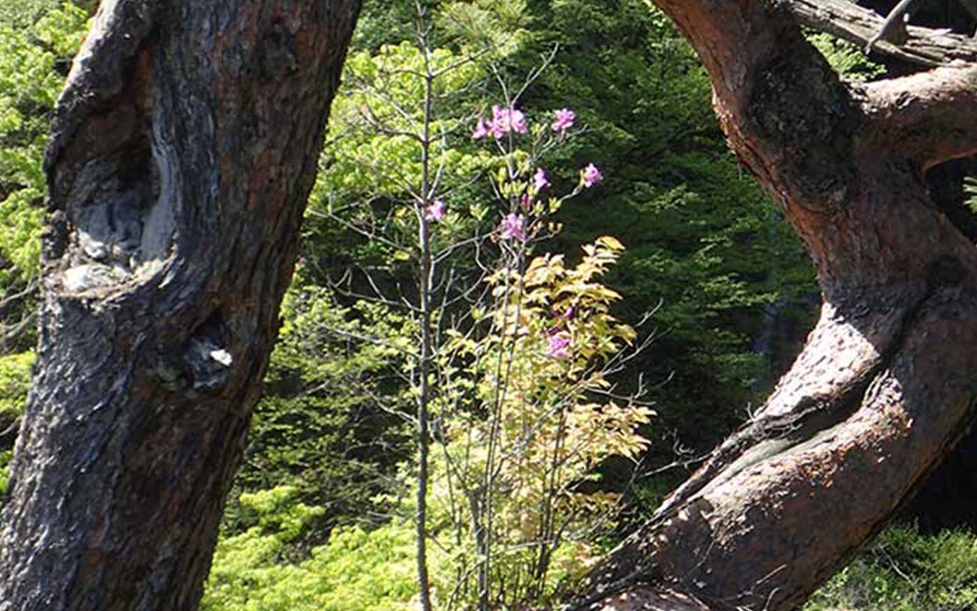 我が子を抱くように自分の幹でミツバツツジ(ムラサ. キツツジ)を育てているアカマツ。 不動大橋からその姿を見ることが出来る。