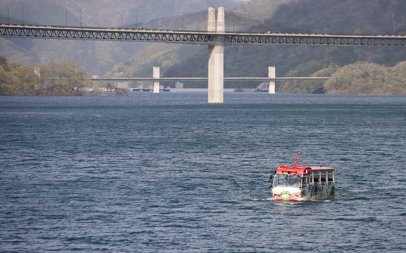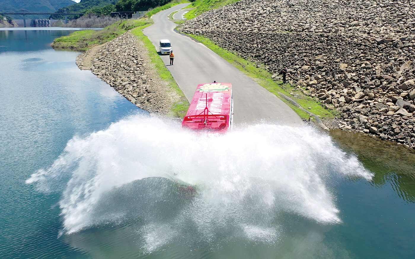 陸上を走行するバスがそのまま八ッ場あがつま湖にスプラッシュ・イン!?湖上を周遊するユニークな体験を提供します。