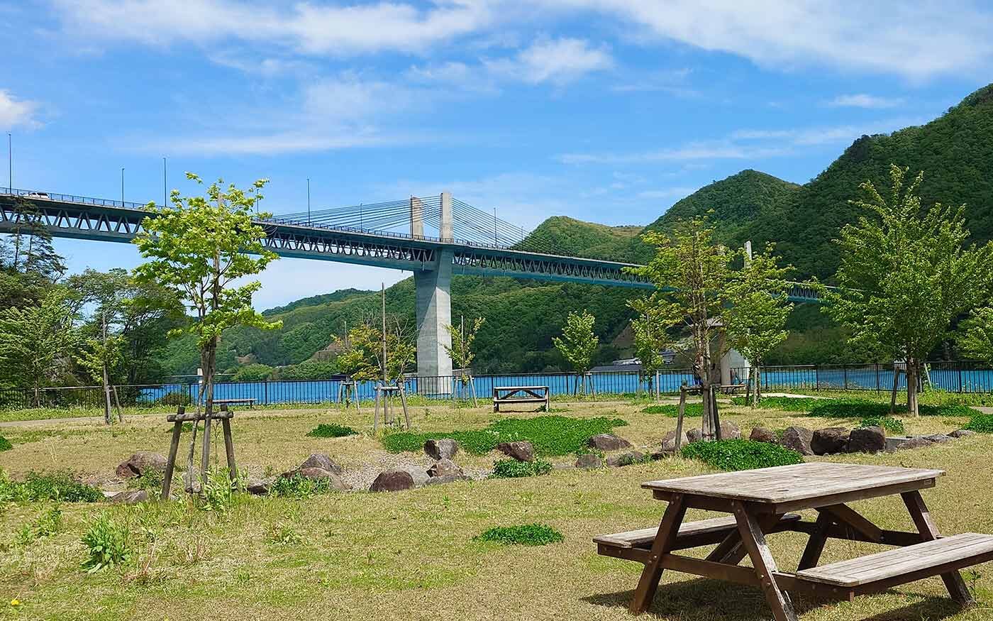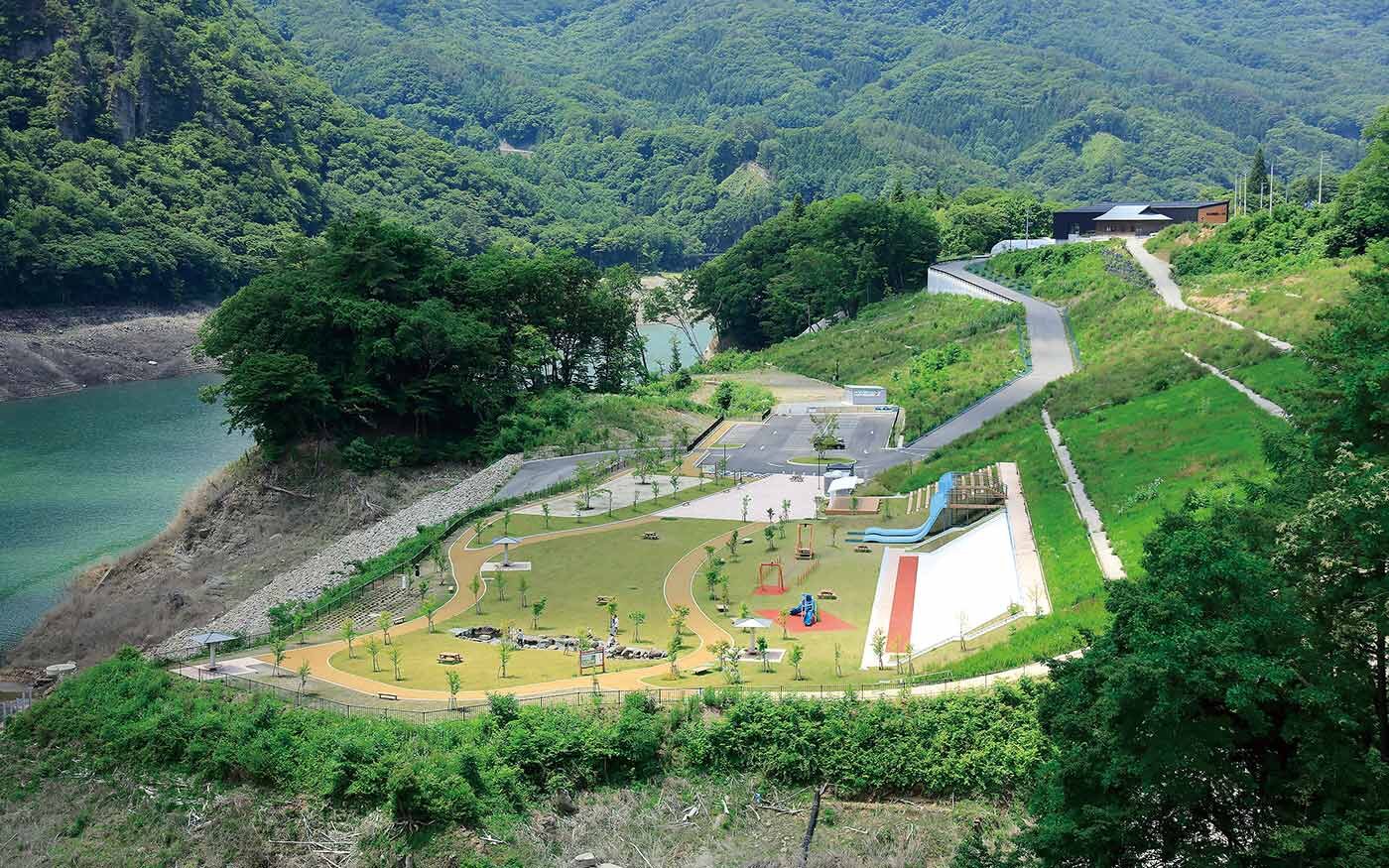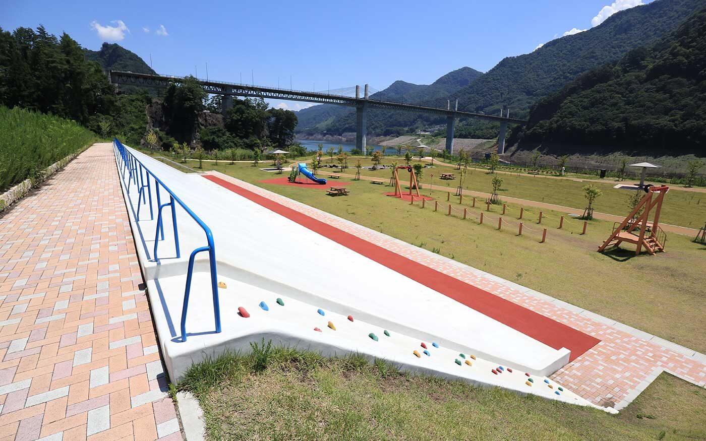 八ッ場あがつま湖の畔にある、コンパクトながら存在感のある滑り台が注目されている公園です。