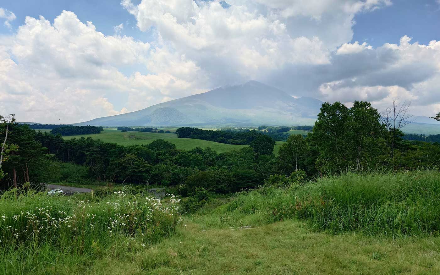 浅間家畜育成牧場(浅間牧場)の広大な敷地内にあり、気軽にハイキング気分で登れる小高い山です。山頂からはそびえ立つ雄大な浅間山の姿と広大な牧草地が織りなす、のどかなパノラマが広がります。