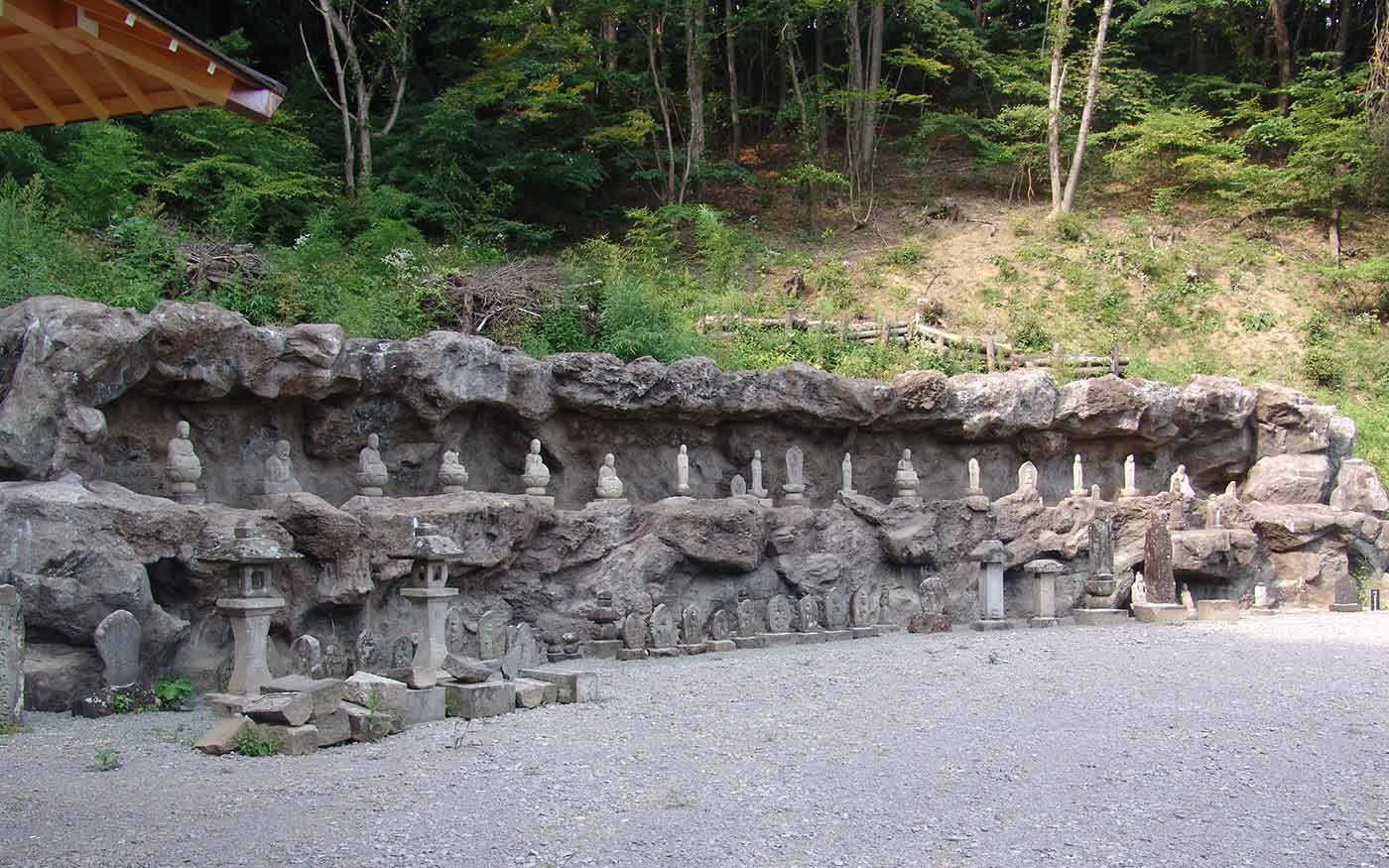 三ツ堂と呼ばれるお堂の右隣りに、江戸期を中心に作られた約70体の石仏が並べられている。